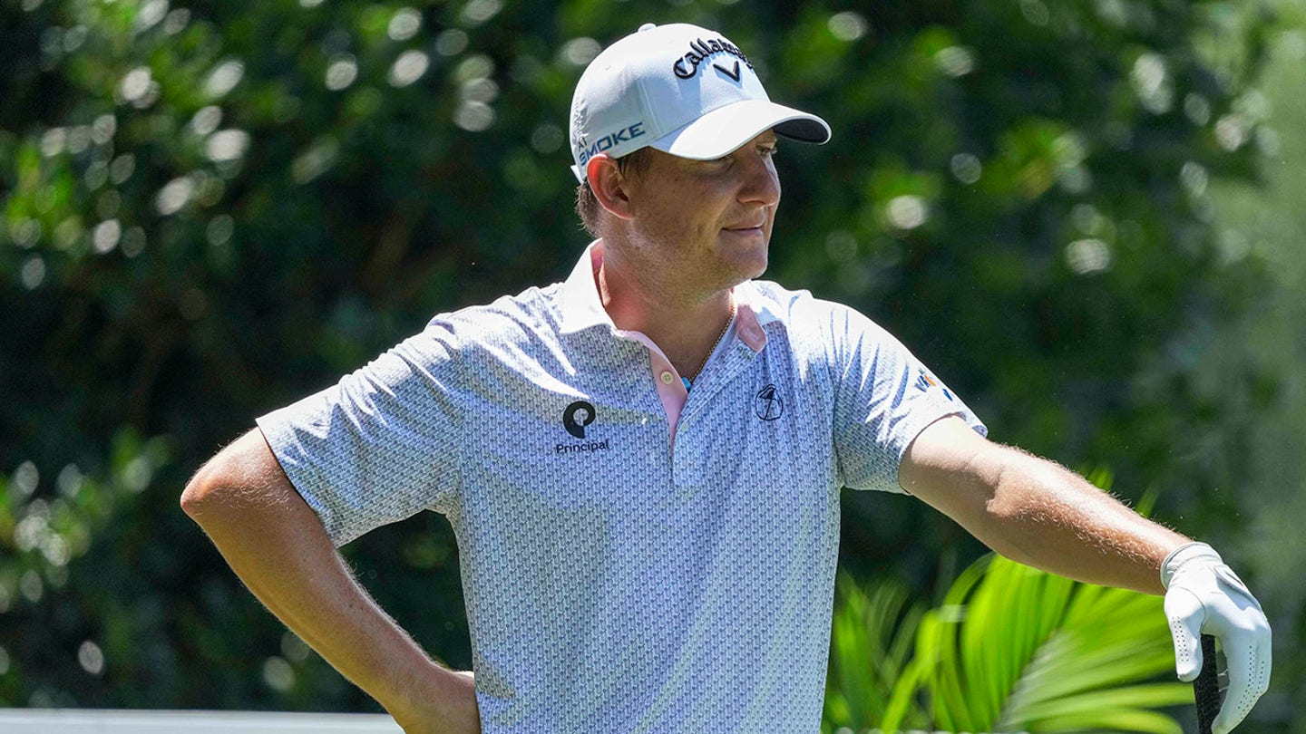 ينتظر إميليانو جريلو في الحفرة الخامسة عشرة خلال الجولة الأولى من بطولة ويندهام للعبور في نادي سيدجفيلد الريفي. (Jim Dedmon/USA Today Sports)